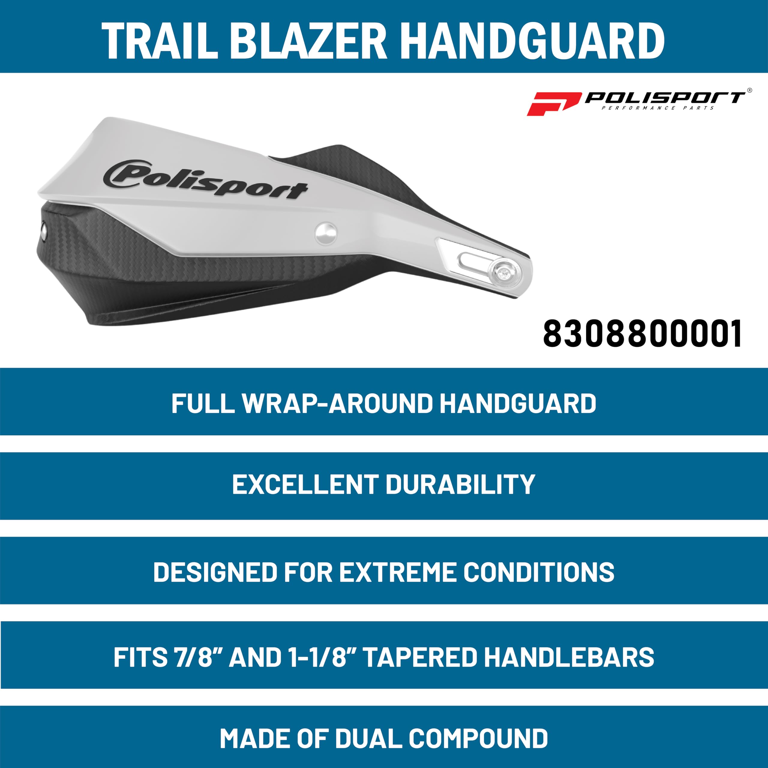 Set di paramani Polisport Trial Blazer bianco e nero - 8308800001. star (1). 65,71 € IVA inclusa. colore COLORI: Questo esclusivo modello di paramani Polisport è disponibile in nove diversi colori per adattarsi a vari modelli di moto: bianco/nero, nero, blu/nero, arancione/nero, rosso/nero e grigio/nero. MX FLOW è un paramani in plastica realizzato in doppia iniezione, con un look e un design moderno, sviluppato per offrire la miglior protezione possible... CARATTERISTICHE: Questa protezione è fissata con 2 punti di fissaggio tramite una barra in alluminio che garantisce grande robustezza strutturale e resistenza all'abrasione. Aspetto moderno sviluppato per offrire la migliore protezione possibile per le mani e la pompa freno. POLISPORT SET PARAMANI TRAIL BLAZER 2 E SET DI PRODOTTO: Pezzo di plastica di materiale a doppia resistenza combinato con aree di fibra di carbonio. Montaggio facile e veloce con una sola chiave a brugola da 5 mm. Paramani Moto Universali Polisport 8308800004 - Paramani Trail Blazer 2 Punti Di Fissaggio Con Barra In Plastica MX-Style Con Kit Di Montaggio Incluso Compatibile Con Tutti I Modelli MX/Enduro En Color Arancione/Nero Protezione Mani Enduro Mx Adatto a manubri con diametro esterno di 22-28 mm e manubri con diametro interno di 13-18 mm. DESIGN: La robustezza e la resistenza insieme ad un design concepito per fornire a questo paramano un'ampia area di protezione permette al Trail Blazer di essere il paramano ideale per condizioni estreme.
